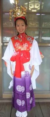 腰には兵児帯 (子供のゆかた帯)を結んで 上着(ちはや)を留めます。