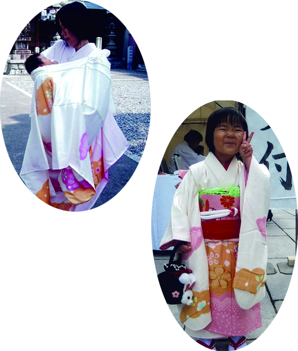 女の子は一ツ身・三ツ身もしくは四ツ身を肩上げや腰上げをして着ます。