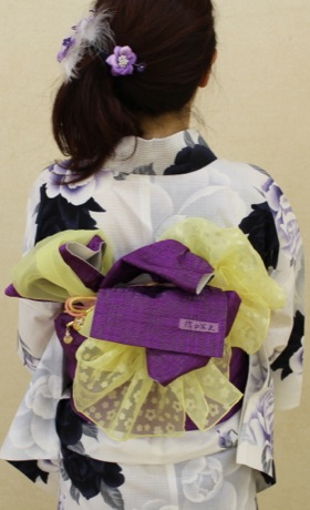 黄色の浴衣帯がアクセントになるように結びます。