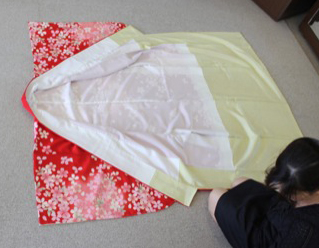 ④ ③で折り返した下前おくみの上に、上前おくみを重ねます。