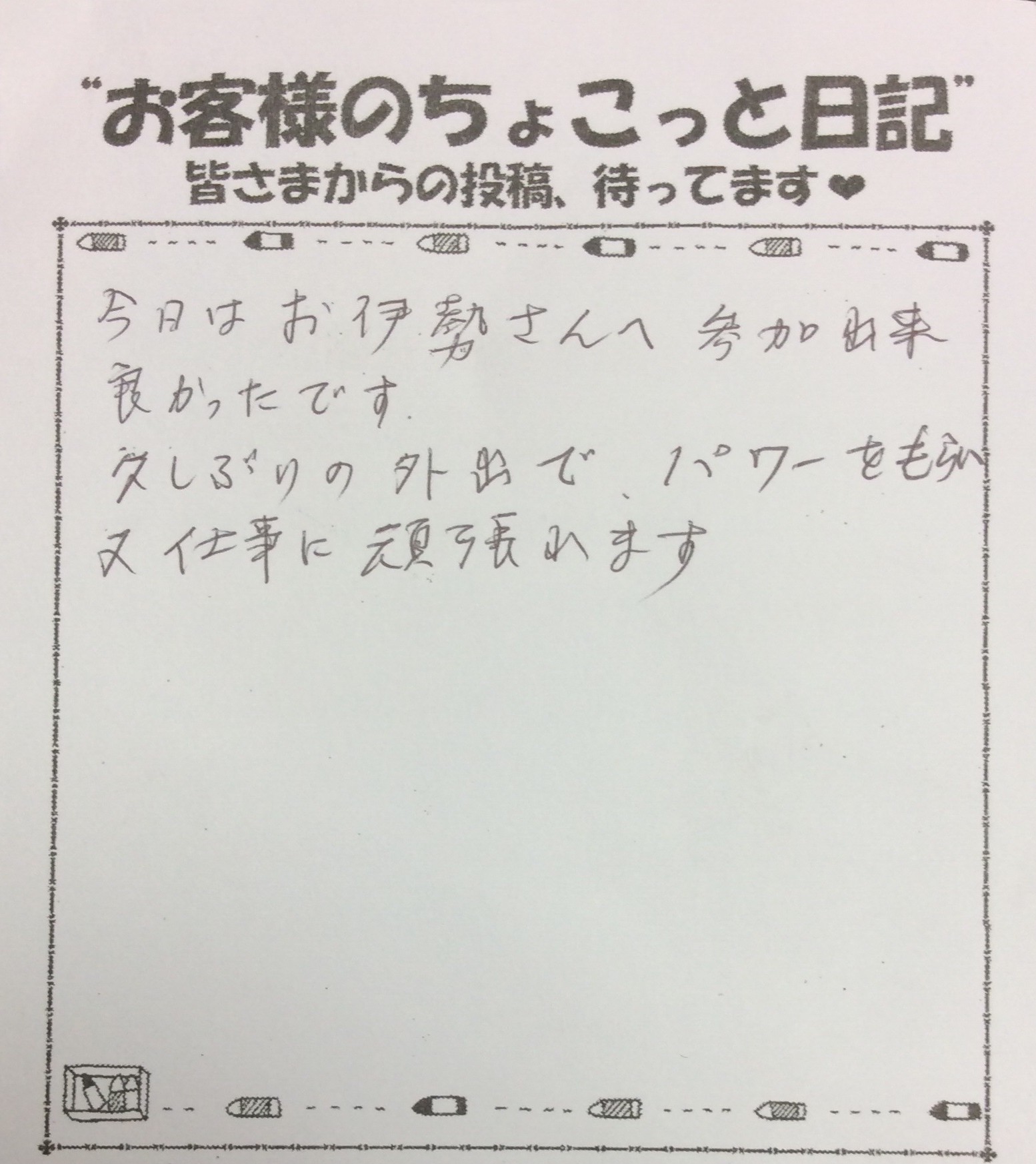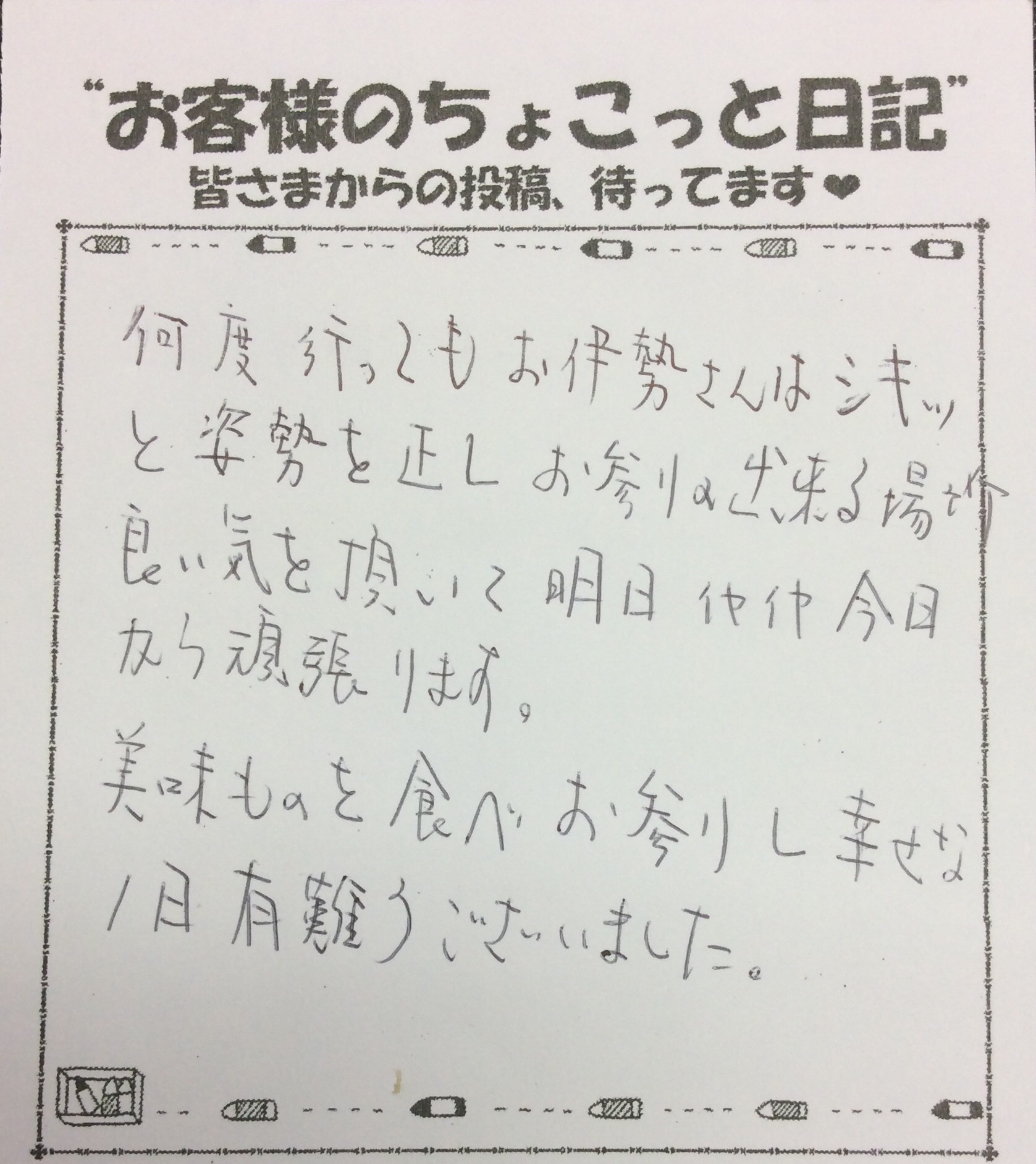 お伊勢さんへ行って元気を貰いました! お客さまから続々とお礼の声を頂きました。
