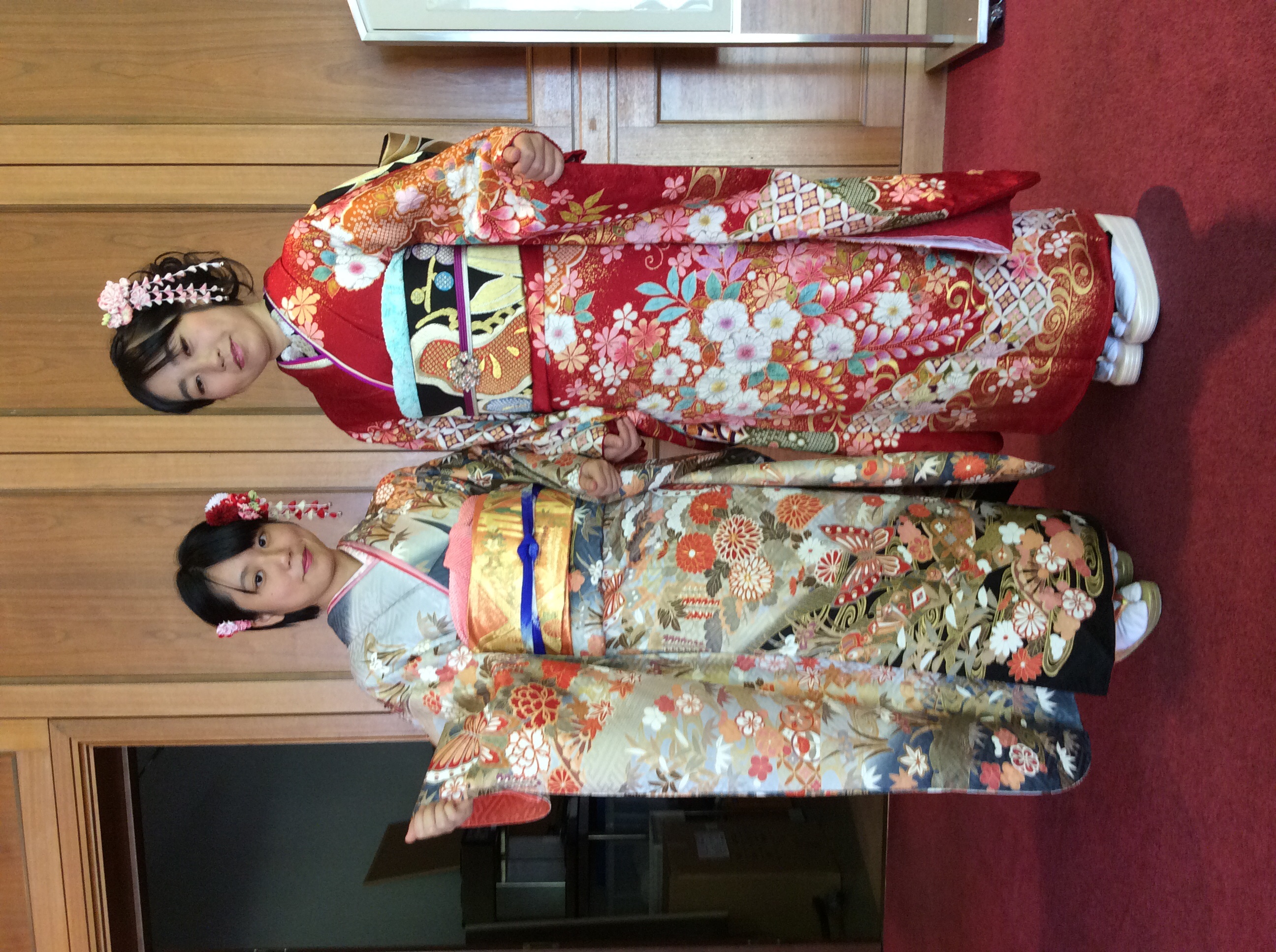 右が お姉さま、 華やかな 辻が花の振袖です 。