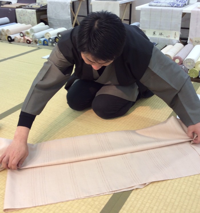 神谷さんの左手の横のエンジ、ベージュの2反が板締めです。