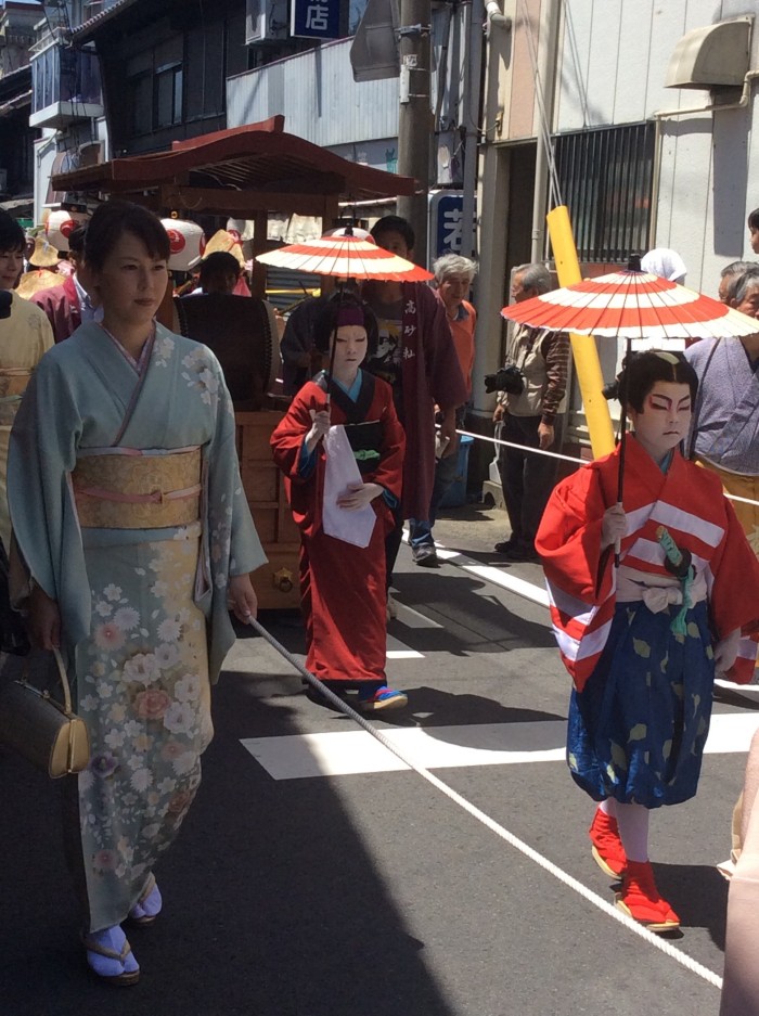 役者さんの横にお母さんが訪問着を着ていっしょに歩くのが慣わしなんです。