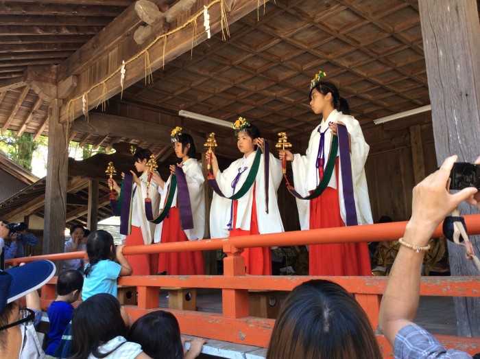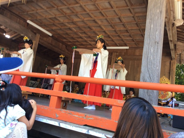 お練りが三輪神社へ入ったら舞殿で舞が始まりました。