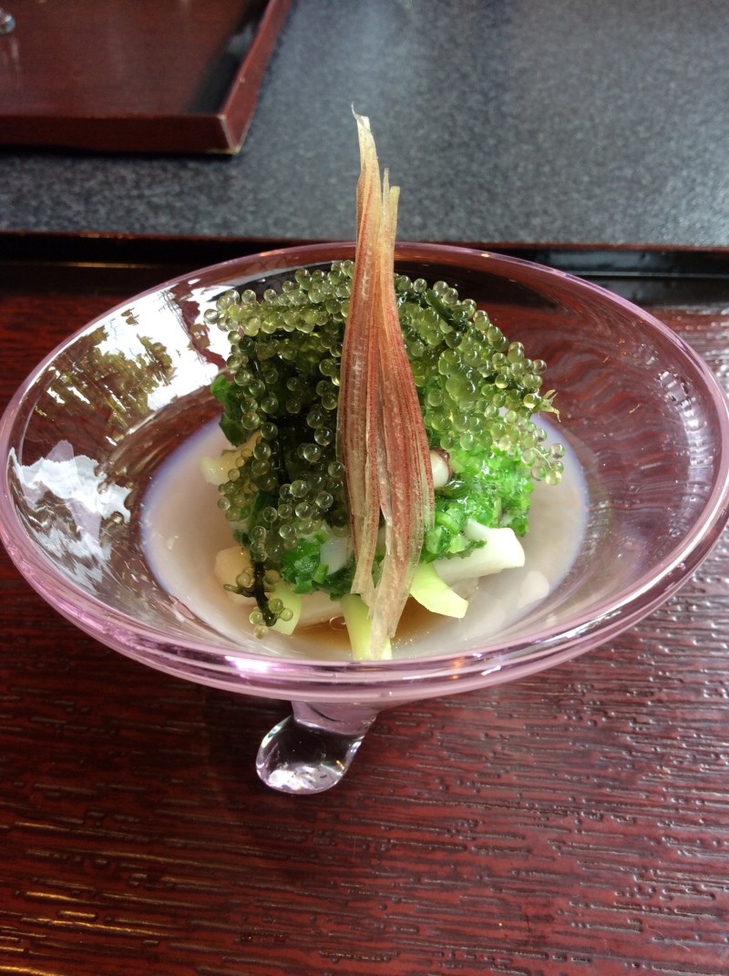 ブリブリの海ぶどうが乗ったガラス鉢は酢の物。