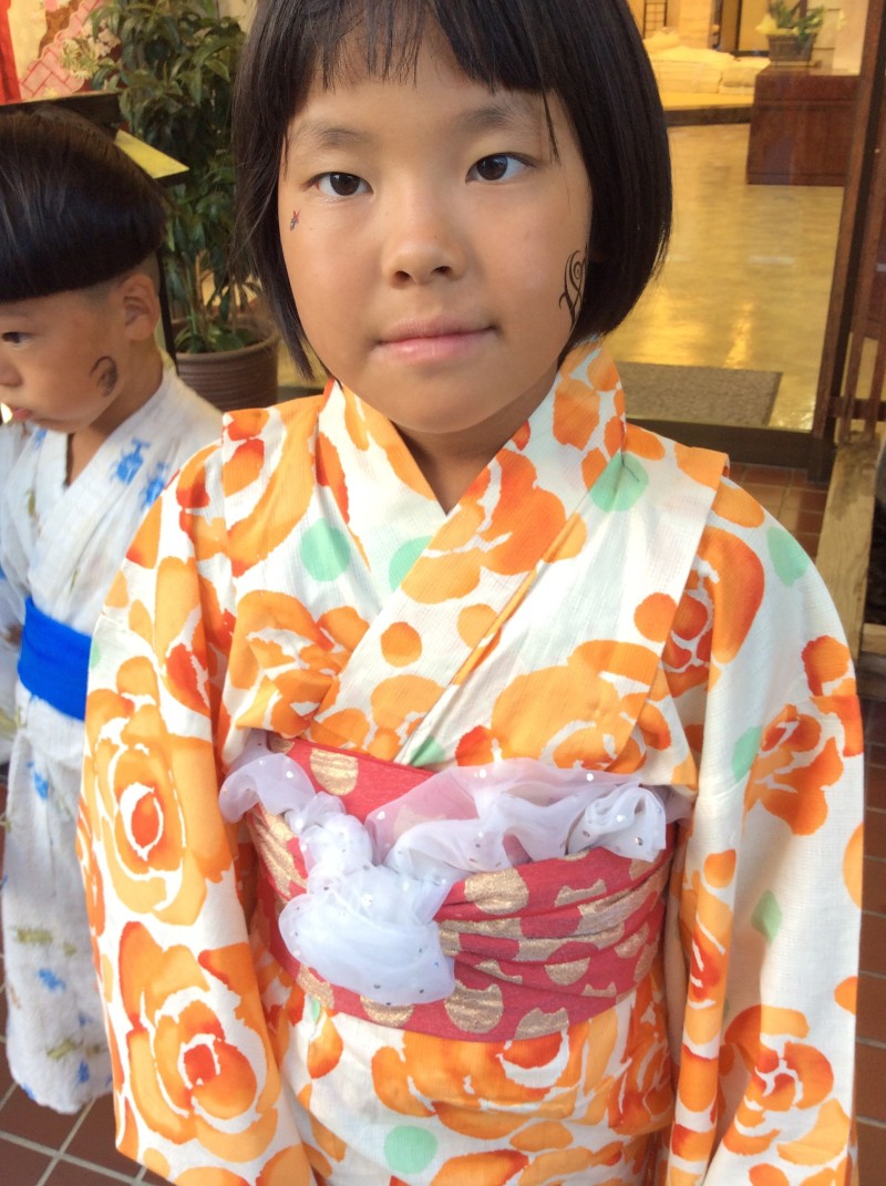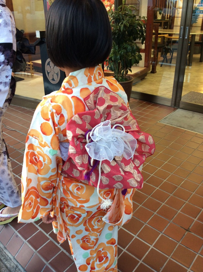Tちゃんは背がグンと伸びたので大人の浴衣を細身に仕立てて、肩上げだけして腰紐1本で着せました。