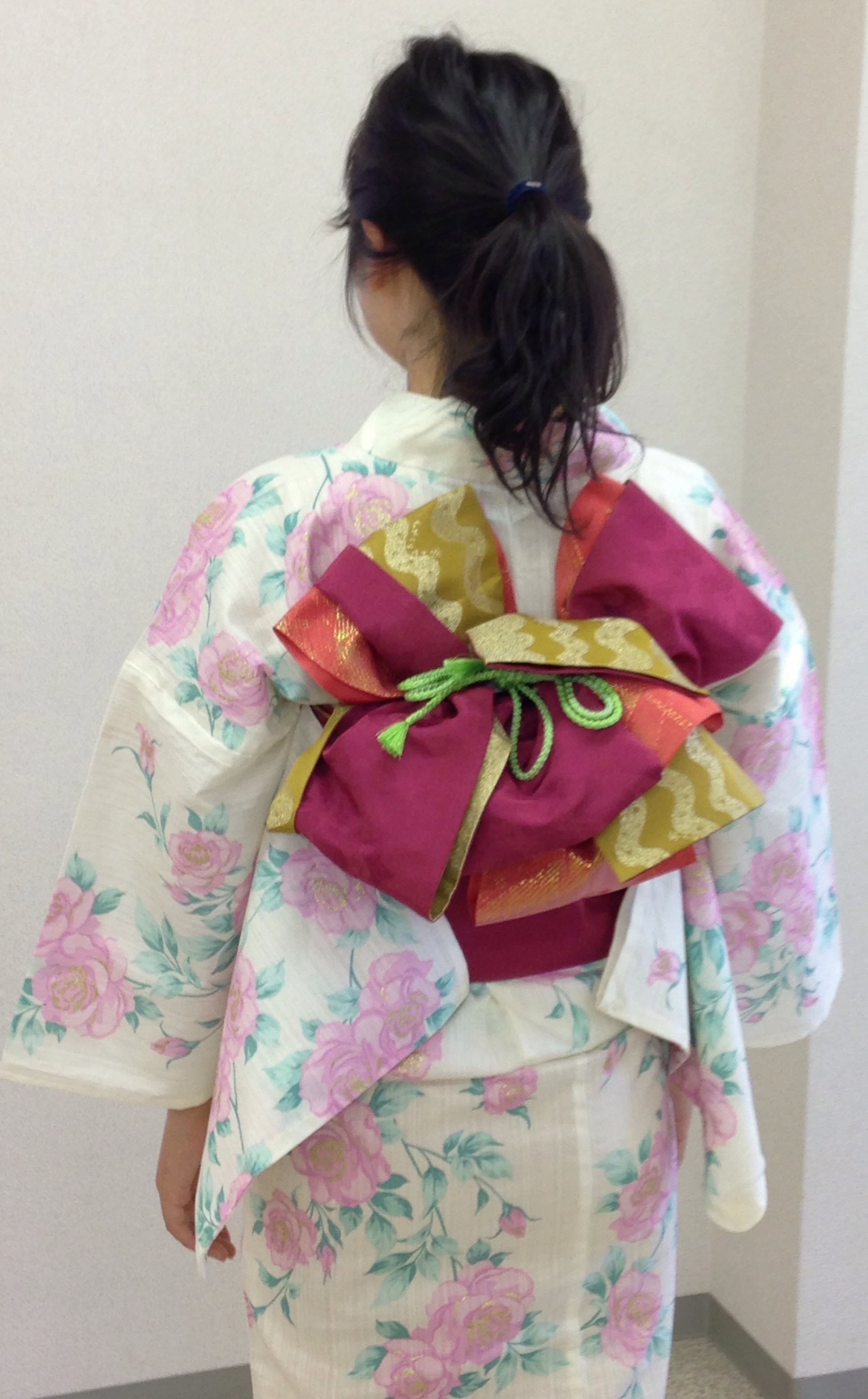 今回は、元々お持ちの朱色の浴衣帯に、新しい深みのある濃いピンクとゴールドのリバーシブルの浴衣帯2本結び。