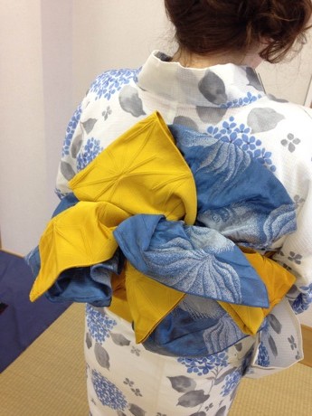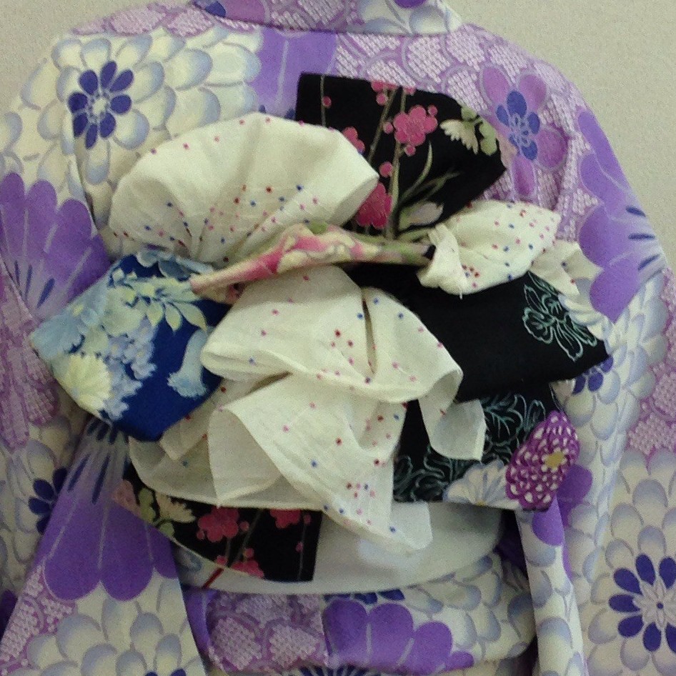 帯はリバーシブルの浴衣帯と、縁が刺繍で透かし模様になっているちょっと変わった兵児帯。