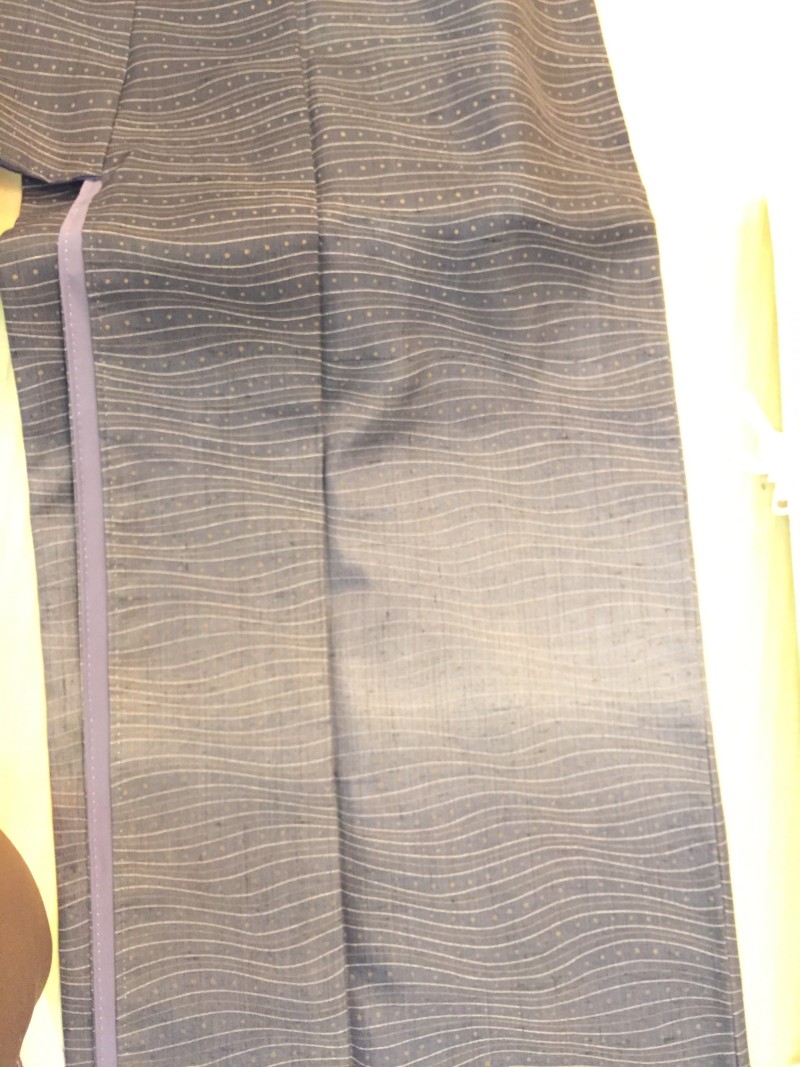 「この着物、スゴイんだよ、 この細い線が縫い目全部で合うように染められてたの」