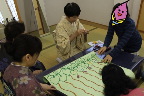 みんなでワイワイ言いながら、楽しく着付けの練習。