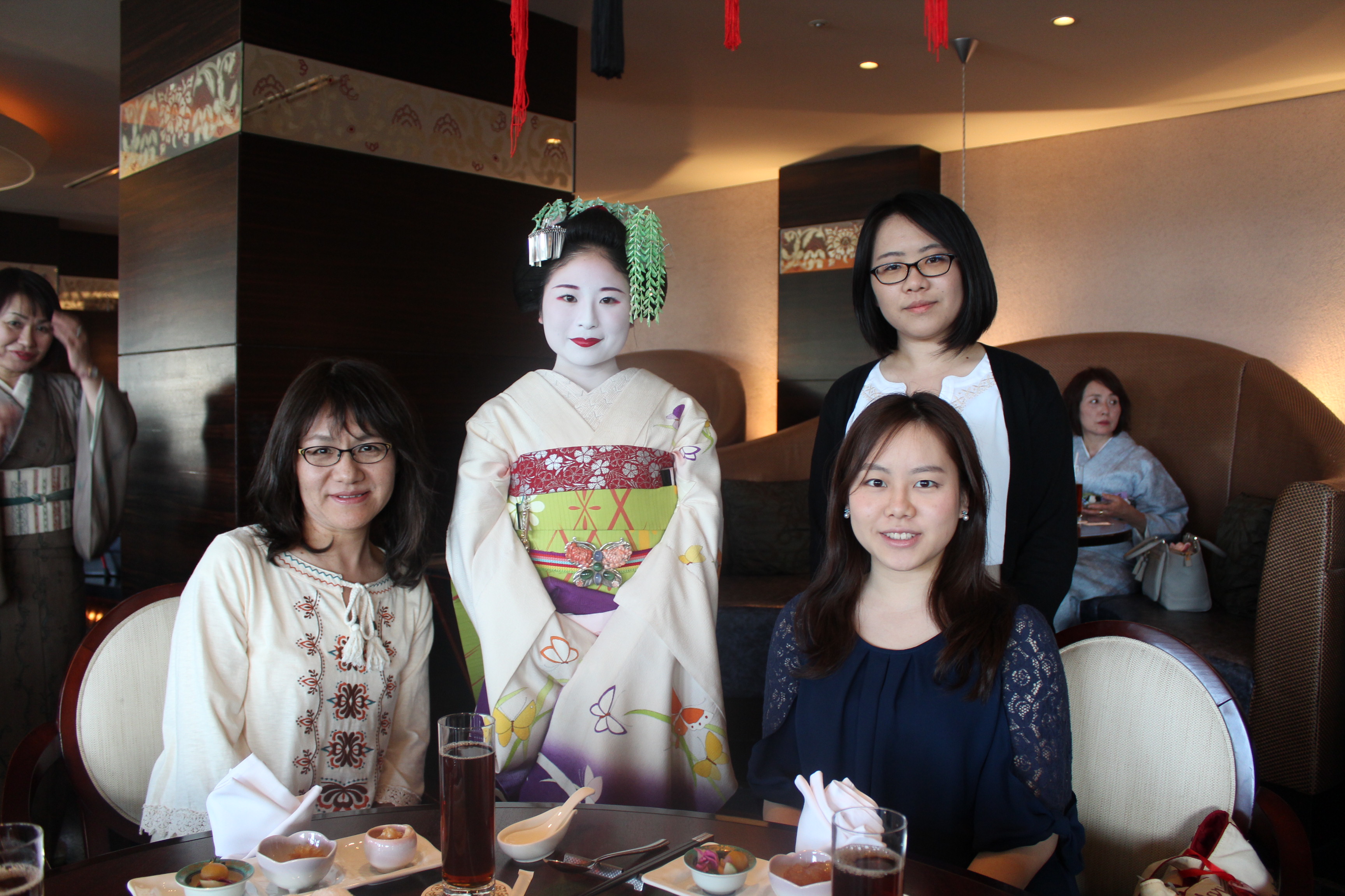 京都の料理屋さんでのお食事、舞妓さんとのツーショットも着物が似合います。