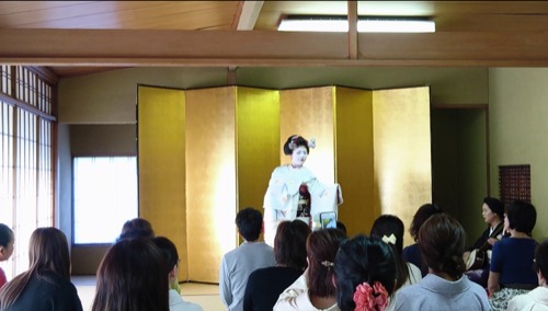 ホテルに着いたら、日本庭園のあるお座敷で舞妓さんの踊りを披露してもらいました。