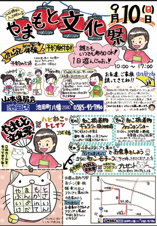 糸をかし通信9月号、または当日店頭受付、池野駅でお配りする「やまもと文化祭」の案内をみてね!