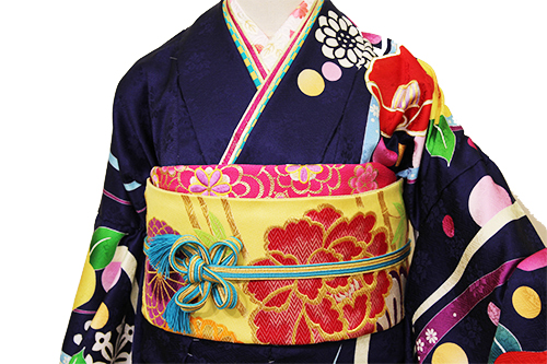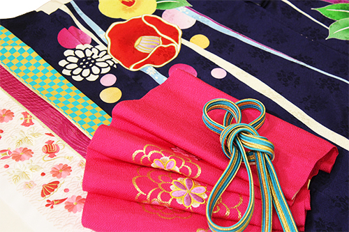 帯締めも統一感のあるショッキングピンクの