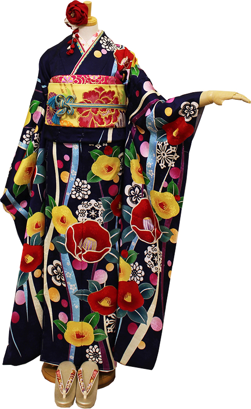 爽やかなブルー地にPOPなドット柄、真っ赤なツバキが可愛い振袖