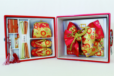 まず、着物に合わせて小物をコーディネートします。便利な作り帯のセット(帯・帯〆・箱せこ・草履・バック)もあります。作り帯ということで、お家でも簡単に着付けをすることができ、大変便利です☆
