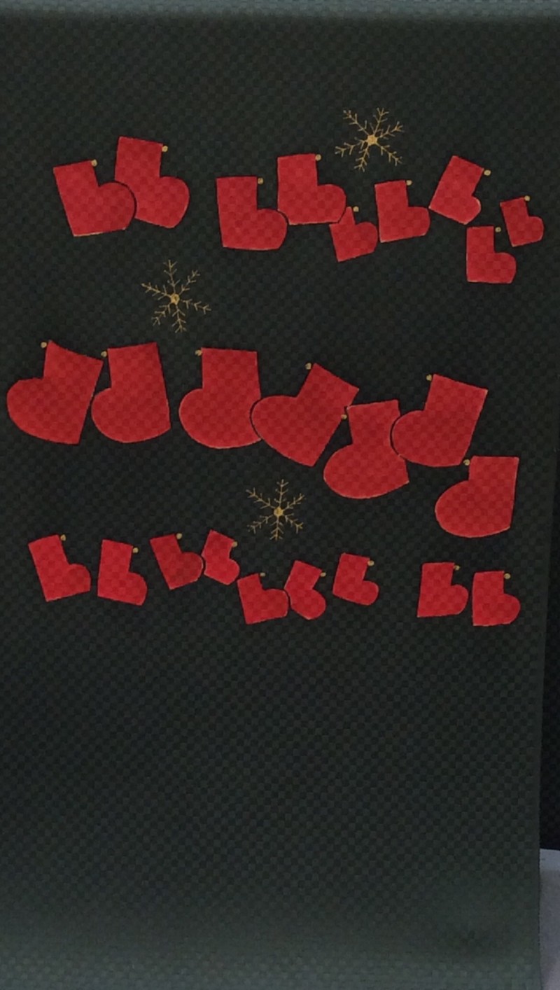 深いクリスマスカラーのグリーンにエンジの靴、所々に雪印がオシャレです。