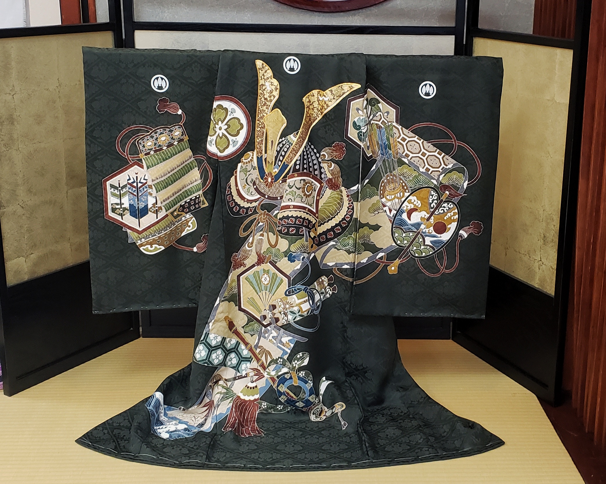 熨斗目の色は、黒や紺が一般的で、柄も鷹、兜、竜といった力強い図柄がベーシックです。