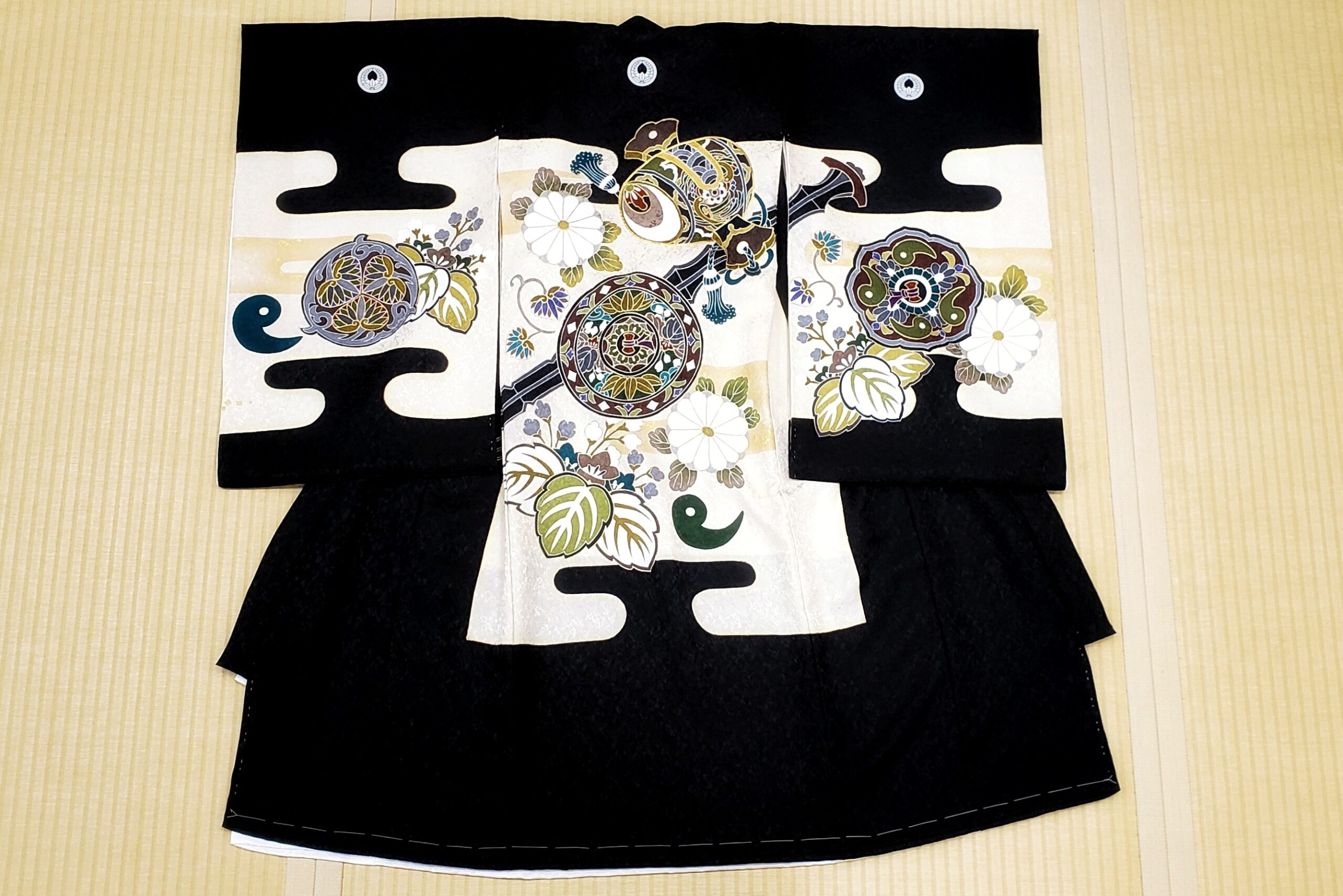 大人と同じ大きな家紋が5つ入る、一番フォーマルな着物です。これは、その子が「家を継ぐ大切な存在」であることの証。小さな体に大きな家紋が入った着物を掛けると、ご先祖様に守られているような、目に見えない力を感じます。